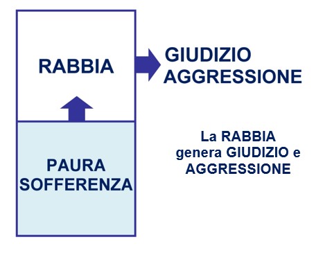 Un altro aspetto importante è che non solo la sofferenza genera rabbia ma anche la paura che nasce dalla sofferenza genera a sua volta rabbia. Facciamo un esempio semplice: se il nostro compagno/a non ci chiama per tutto il giorno, noi possiamo sentirci “abbandonati”, e questa sofferenza (che è l’emozione primaria) genera la rabbia e la paura di essere abbandonati. In questo caso anche la paura di essere abbandonati genera rabbia a sua volta.